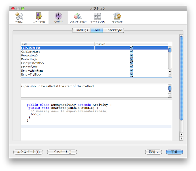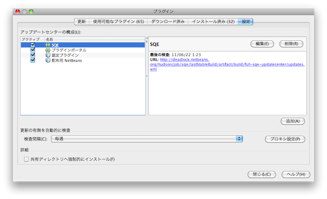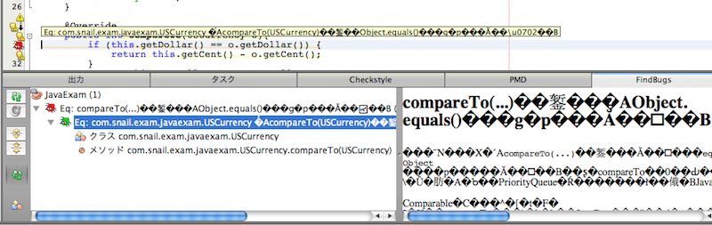 $ pwd /Applications/NetBeans/NetBeans 7.0.app/Contents/Resources/NetBeans/sqe/modules/ext/tmp $ ls META-INF fancy-hist.xsl messages.xml summary.xsl bugcollection.xsd fancy.xsl messages_fr.xml version.properties bugrank.txt findbugs.xml messages_ja.xml default.xsl findbugsplugin.xsd net edu messagecollection.xsd plain.xsl $ mv messages_ja.xml messages_ja.xml.original $ cat messages_ja.xml.original | iconv -f sjis -t utf-8 | sed -e "s/Shift_JIS/UTF-8/" > messages_ja.xmlsed は、<?xml version="1.0" encoding="Shift_JIS"?> を <?xml version="1.0" encoding="UTF-8"?> に変換している