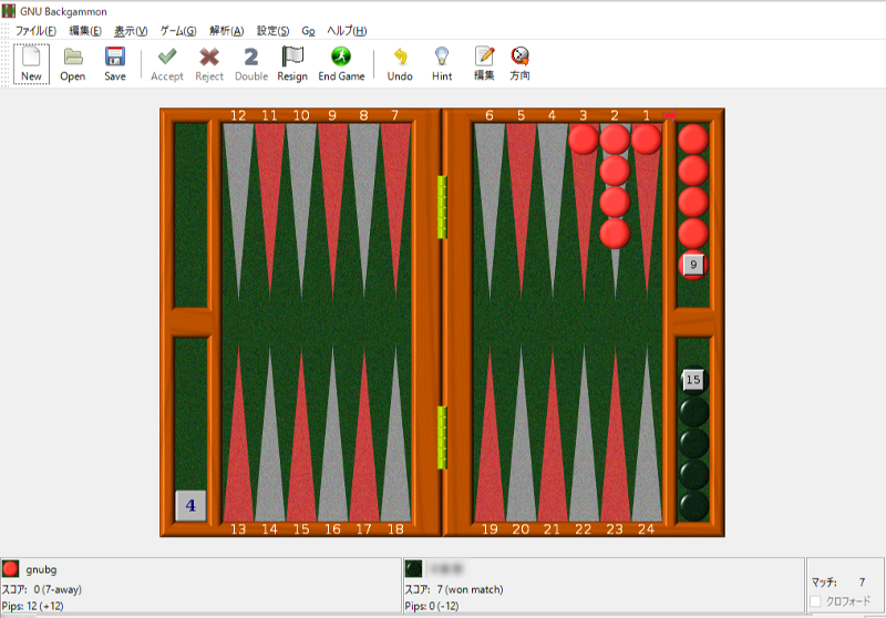 - gnubg のデフォルト設定 "world class" だと、せいぜい2回に1回か、3回に1回しか勝てない