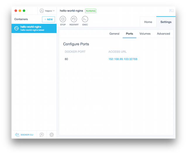 $ docker-machine start default Starting VM... Started machines may have new IP addresses. You may need to re-run the `docker-machine env` command. $ docker-machine env # Run this command to configure your shell: # eval "$(docker-machine env default)" $ $(docker-machine env default)これでようやく docker コマンドが使えるようになる