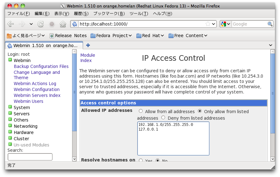 - しょうがないので設定ファイルを直接変更して webmin を再起動