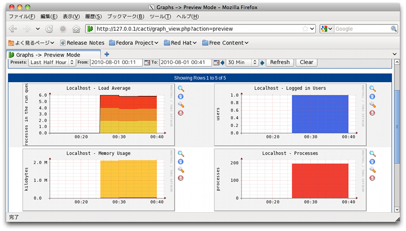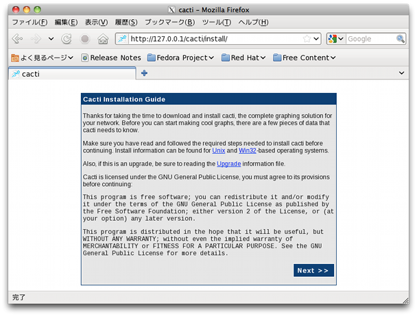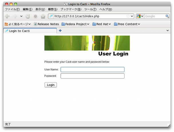 $ mysql -u root -p Enter password: mysql> create database cacti; Query OK, 1 row affected (0.26 sec) mysql> grant all privileges on cacti.* to cactiuser@localhost identified by 'cactiuser'; Query OK, 0 rows affected (0.34 sec) mysql> exit Bye $ mysql -u cactiuser -p cacti < /usr/share/doc/cacti-0.8.7f/cacti.sql Enter password: