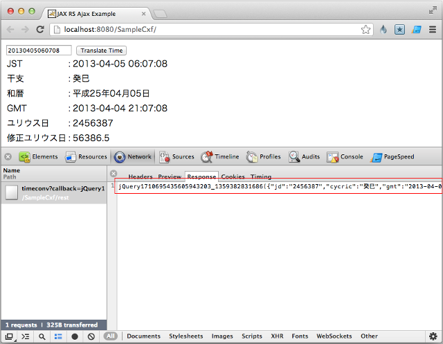 [~]$ curl http://localhost:8080/SampleCxf/rest/timeconv/json/jst/20130405060708 | python -mjson.tool