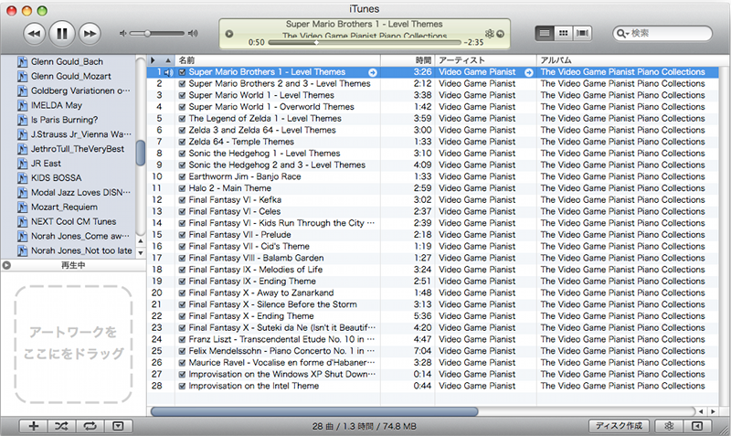[~]$ wget -r http://www.videogamepianist.com/audio.html(mp3のタグが適切に設定されているので、wget で取得して、iTune に D&D すれば楽曲名が入る)