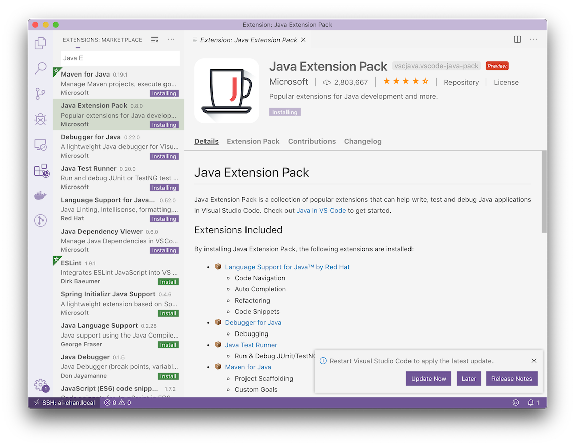- Java Extension を選択すると、一通りその他の必要な plugin がインストールされる