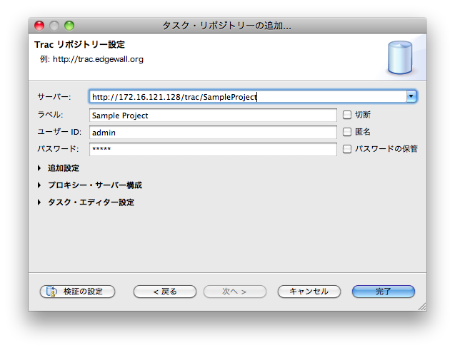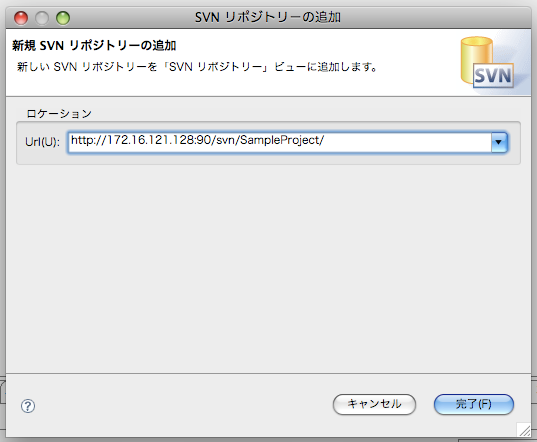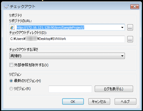 3. ソースが格納されている SVN レポジトリを指定する (ユーザ名とパスワードを設定する)
