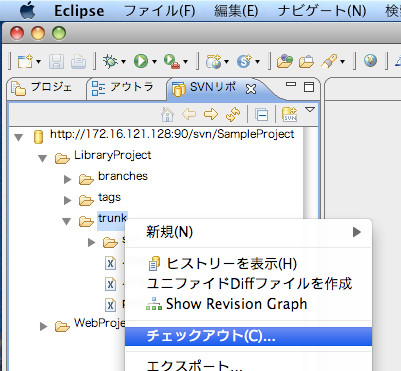 1. [ウィンドウ]-[ビューの表示]-[その他] で、SVNリポジトリを選ぶ