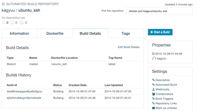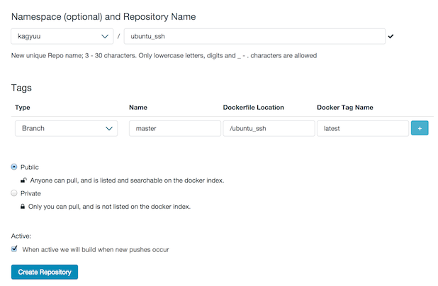 - イメージ に ${ユーザ名}/コンテナ名 の tag をつける
