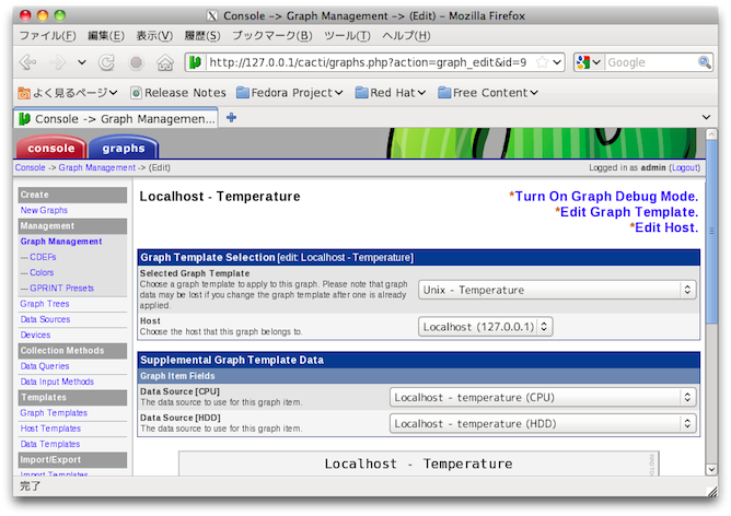$ sudo /var/lib/cacti/scripts/temp.sh CPU:49 HDD:51$改行しないのがミソ