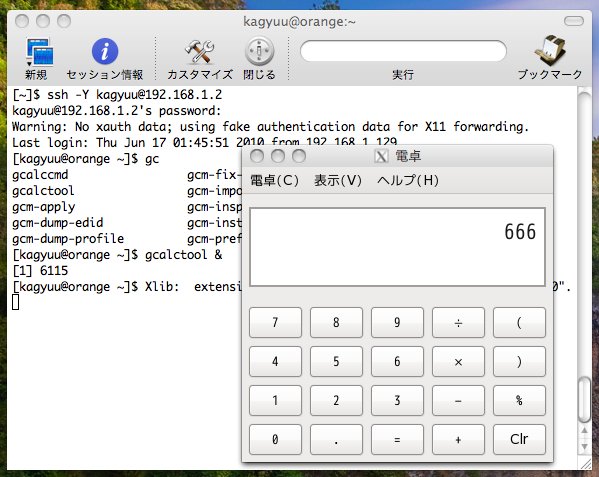 [~/.ssh]$ uname -a Darwin hondou-atsushi-no-MacBook.local 10.8.0 Darwin Kernel Version 10.8.0: Tue Jun 7 16:33:36 PDT 2011; root:xnu-1504.15.3~1/RELEASE_I386 i386 i386 [~/.ssh]$ ssh kagyuu@192.168.1.2 Last login: Mon Jul 18 22:16:56 2011 from 192.168.1.132 [kagyuu@orange ~]$ uname -a Linux orange.homelan 2.6.34.9-69.fc13.i686.PAE #1 SMP Tue May 3 09:13:56 UTC 2011 i686 i686 i386 GNU/Linux [kagyuu@orange ~]$