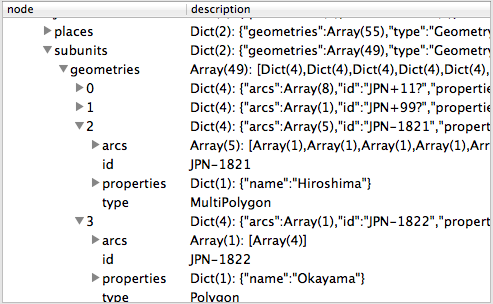 もとの GeoJSON で、県1つ分の情報は、subunits.features 配列の1つ分 (前の章の「できた GeoJSON 形式のデータ」を参照)