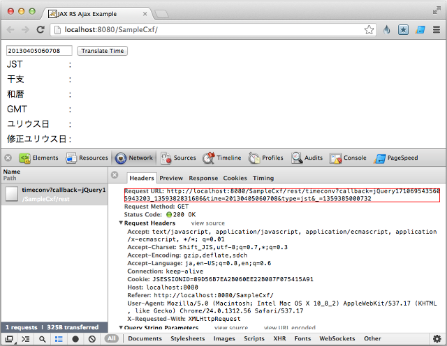 [~]$ curl http://localhost:8080/SampleCxf/rest/timeconv/json/jst/20130405060708 | python -mjson.tool