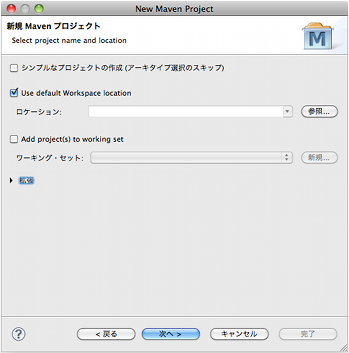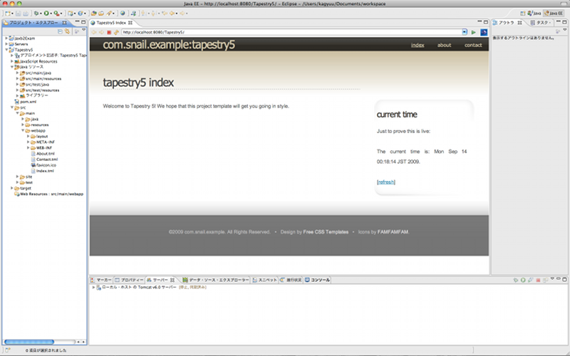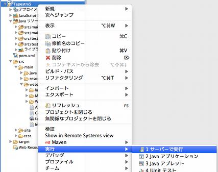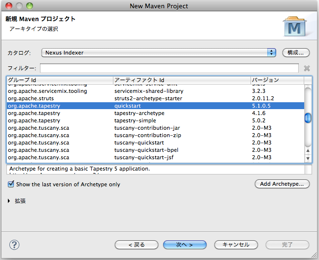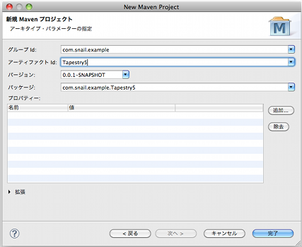 $mvn archetype:generate -DarchetypeGroupId=org.apache.tapestry -DarchetypeArtifactId=quickstart -DgroupId=org.apache.tapestry -DartifactId=tutorial1 -DpackageName=org.apache.tapestry5.tutorial $ cd tutorial1/ $ mvn eclipse:eclipse -Dwtpversion=2.0 -DdownloadSource=true[追記] archetype:create は、Maven 3.0.5 で廃止