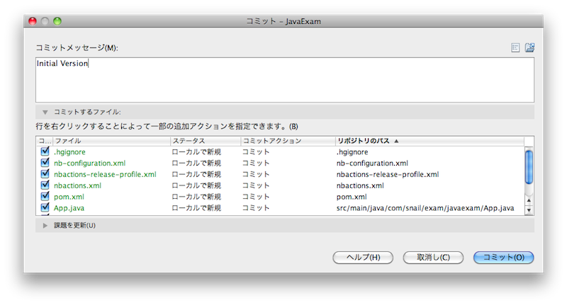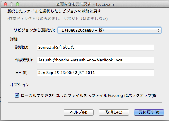[hguser@orange ourwork]$ hg history チェンジセット: 0:9e3b9f7206c9 タグ: tip ユーザ: Atsushi@hondou-atsushi-no-MacBook.local 日付: Fri Jul 15 00:01:14 2011 +0900 要約: Initial Versionssh のログインは hguser ユーザだけど、Mac (クライアント) 側の Atsushi で commit されている