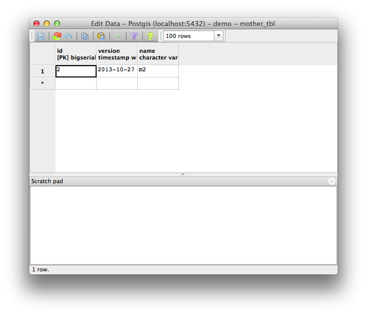INSERT INTO mother_tbl (version, name) VALUES (current_timestamp, 'm2');